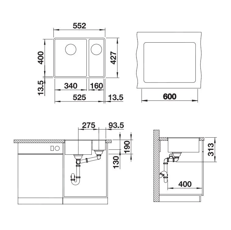 - totale afmeting van de spoelbak: 552 x 427 mm